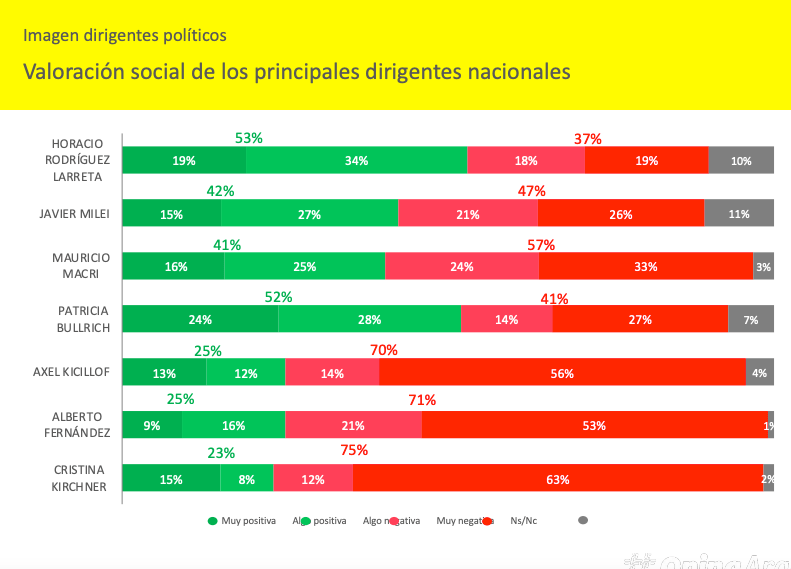 De acuerdo con el sondeo de mayo de Opina Argentina, Macri cuenta con una imagen positiva del 41% y una negativa del 57%. El diferencial de -16 puntos porcentuales es mucho menor que los 49 del Presidente y que los 52 de la vice.