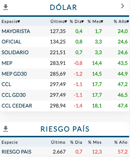 Sin embargo, el mercado financiero reaccionó con cautela a los anuncios. Los dólares bursátiles y el blue, que terminó a 268 pesos, fueron moderadamente hacia atrás, pero las acciones y el riesgo país no dieron tregua. Así quedaron al cierre del lunes para arrancar este martes otra rueda exigente: