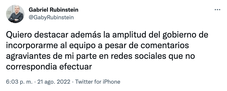 La costura fue difícil y llevó tiempo, pero al final el ortodoxo Gabriel Rubistein será secretario de Programación Económica, en los hechos, el vice del superministro de Economía, Sergio Massa. Víctima actualizada del “te revisamos el Twitter» macrista de febrero de 2016, Rubinstein había quedado stand-by por haber actuado como un verdadero troll y reproductor de memes antikirchneristas, pasado sobre el que este domingo realizó la autocrítica apenas imprescindible para que Cristina Kirchner –presuntamente– le levantara la interdicción. Según surge de sus dichos, el economista lamenta haber proferido esas ofensas por su inconveniencia, pero no necesariamente por su contenido.