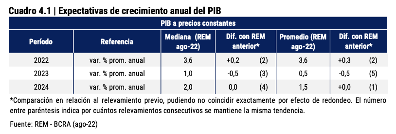 El punto de partida de la economía del año electoral es, claro, el cierre del actual. De acuerdo con el ejemplar de agosto del Relevamiento de Expectativas de Mercado (REM), la encuesta entre analistas que el Banco Central realiza cada mes, 2022 finalizará con un crecimiento económico del 3,6% –3,7% de acuerdo con el top ten de mejores pronosticadores y pronosticadoras de esa variable– y con un IPC del 95% –99,4% para quienes más se destacan en esta materia–.