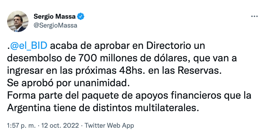Massa volverá de Estados Unidos este viernes después de participar de un evento con ministros de Finanzas en el Banco Interamericano de Desarrollo (BID) y de mantener encuentros en el Fondo Monetario Internacional (FMI), entre otras actividades. Este miércoles, de hecho, anunció con entusiasmo la llegada de 700 millones de dólares del BID, un alivio para las reservas que no deja de ser nueva deuda para un país que, de eso, ya está hasta el cuello.