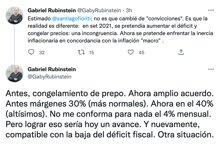 El viceministro de Economía y pata técnica de la gestión de Sergio Massa en el Palacio de Hacienda, Gabriel Rubinstein, dedicó parte del domingo a polemizar vía Twitter. Lo hizo con el diputado Javier Milei, con el economista Manuel Adorni y hasta con el periodista de Clarín Santiago Fioriti, no se sabe si para defender el plan Precios Justos, que sale a la cancha a jugar un partido a todo o nada en un verano que se anticipa caliente, o su propia figura.