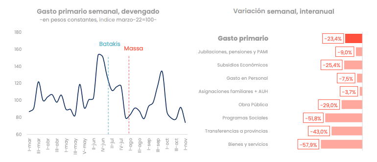 La política económica pretende que, mientras el congelamiento aguanta los trapos por un rato, el ajuste del gasto haga la tarea de fondo. La consultora Analytica sigue semana a semana la evolución del gasto primario, que en los primeros siete días de noviembre se encogió 23,4% interanual.