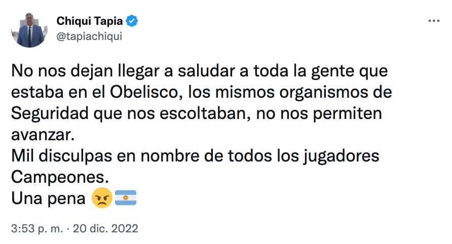 El mandamás de la AFA no se privó de ponderar a sus amigos y de señalar a sus enemigos. Agradeció en Twitter el acompañamiento de Sergio Berni y, con un emoji enojado que parece en verdad una foto carné de sí mismo, cuestionó a los organismos de la Ciudad y de la Nación por no dejarlos «llegar a saludar a toda la gente que estaba en el Obelisco». Vamos, Chiqui: ese micro ya no tenía cómo avanzar y todo se terminó cuando dos muchachos se lanzaron desde un puente sobre el micro descapotable.