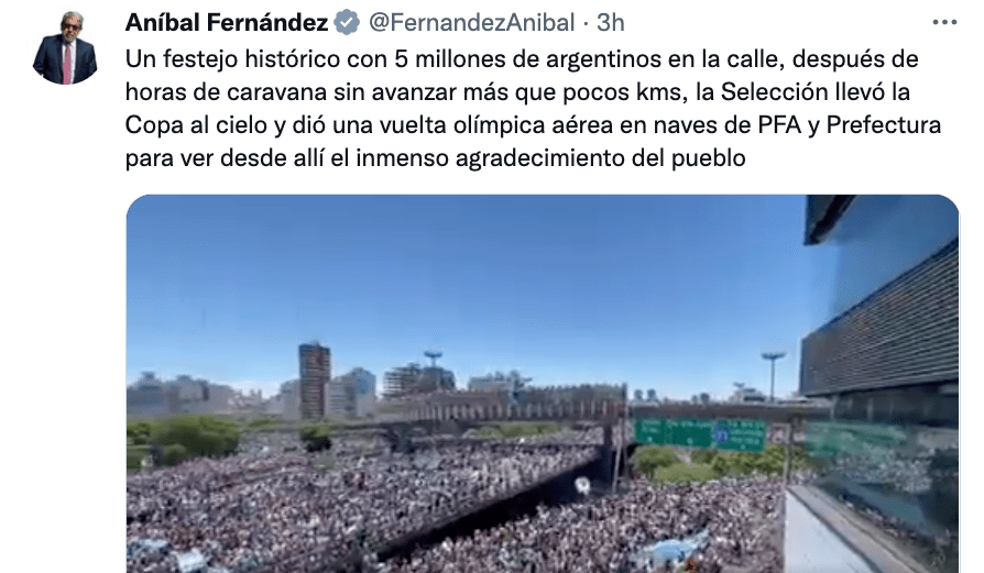 Mientras, desnudando una vez más las internas impresentables del Frente de Todos, Aníbal Fernández, a quien se sumaron Cerruti y el propio Presidente dando RT, se ufanó de haber puesto helicópteros federales para que un grupo de campeones volara sobre la multitud. ¿Fue un mensaje para dar cuenta de que no solo Berni estuvo a la altura o para dejar más expuesta a la Policía de la Ciudad?