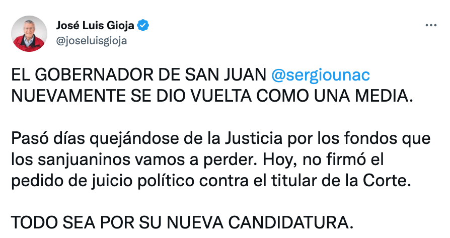 Asimismo, truena el escarmiento contra uno que se subió en la cabecera del colectivo, pero se bajó en la primera parada: el sanjuanino Sergio Uñac. «Nuevamente se dio vuelta como una media», lo sacudió José Luis Gioja, quien voceó lo que es una acusación de todo el oficialismo: aquel temería que la CSJ le haga pagar caro en caso de que su intento de buscar la rerreelección llegue a esa instancia.