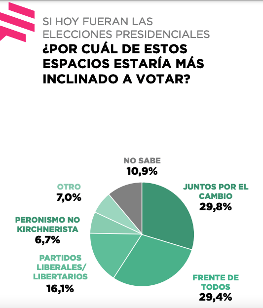 Un tercer factor está dado por las intenciones de voto medidas por sector. De acuerdo con la misma encuesta, el Frente de Todos estaría técnicamente empatado con Juntos por el Cambio, más afectado por la fuga libertaria.