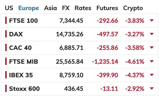 Las bolsas europeas se hundieron entre 3,5 y 5%, números que son de pánico en mercados grandes, menos volátiles que, por caso, el argentino. El castigo fue generalizado, pero el centro del mismo fueron las acciones de los grandes bancos de la Unión Europea, arrastrados por Credit Suisse.