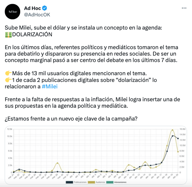 No le resultará fácil. Según un interesante trabajo de la consultora Ad Hoc, la dolarización que propone el minarquista –una que inquieta hasta al Círculo Rojo– se hizo dominante en los diálogos de las redes sociales en la última semana… curiosamente –o no– en paralelo con el recalentamiento del blue.