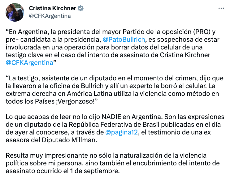 CFK reaccionó calificando de «muy impresionante no solo la naturalización de la violencia política» sobre su persona, sino también «el encubrimiento del intento de asesinato ocurrido el 1 de septiembre».