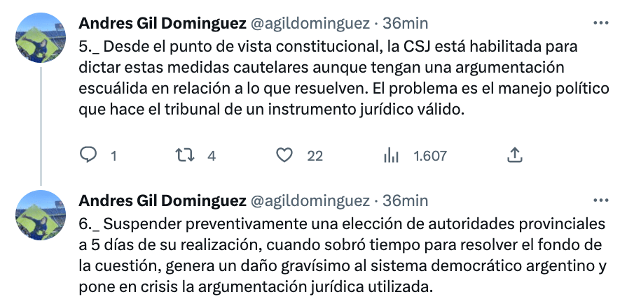 Contrariamente a la «virtual intervención federal de dos provincias» que denunció Wado de Pedro, el constitucionalista Andrés Gil Domínguez puso las cosas en su lugar en un hilo de Twitter: la Corte Suprema actuó conforme a sus atribuciones por estar «en juego el principio republicano de gobierno», pero haber tomado semejante determinación apenas cinco días antes de los comicios, cuando los pedidos de medidas cautelares habían sido elevados varias semanas atrás, constituye una disrupción peligrosa del proceso electoral.