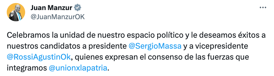 Al revés de la candidatura fallida de De Pedro, la de Massa fue anunciada oficialmente en la cuenta de Twitter de la Unión por la Patria. El mensaje agradeció la generosidad de los dos principales defenestrados, Wado y Daniel Scioli, y no le destinó ni una mención a Manzur, acusado abiertamente de haber descubierto un juego que no estaba cerrado y de haber sido uno de los causantes de la crisis.