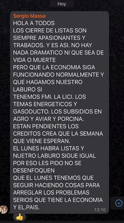 ¿Es eso diferente de lo que sucedió? El detalle fue que, en lugar de ser él mismo quien hiciera el planteo, fueron los gobernadores mencionados los que abordaron a CFK con esos argumentos. Luego, en el mano a mano que ambos tuvieron, probablemente Massa lo repitió. ¿Habrá sido explícita la amenaza de renuncia y caos que viene desmintiendo –ayer mismo, en un mensaje de chat prolijamente filtrado– para demostrar que es un jugador de equipo, pero que en su momento trascendió desde su entorno más cercano, que habló del «hartazgo» que le generaban las ambiciones personales de tanto precandidato descomprometido con la gestión?