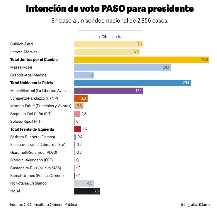 Una, de CB Consultora Opinión Pública –que tiene, entre otros contratos, uno con el Gobierno de Ciudad de Buenos Aires– arrojó una ventaja de JxC sobre la UP, mostró Clarín, 4,7 puntos porcentuales que se ubican por encima del margen de error (+/–1,8). Fue realizada entre el 25 y el 27 de junio y en base a 2.856 entrevistas online en todo el país.