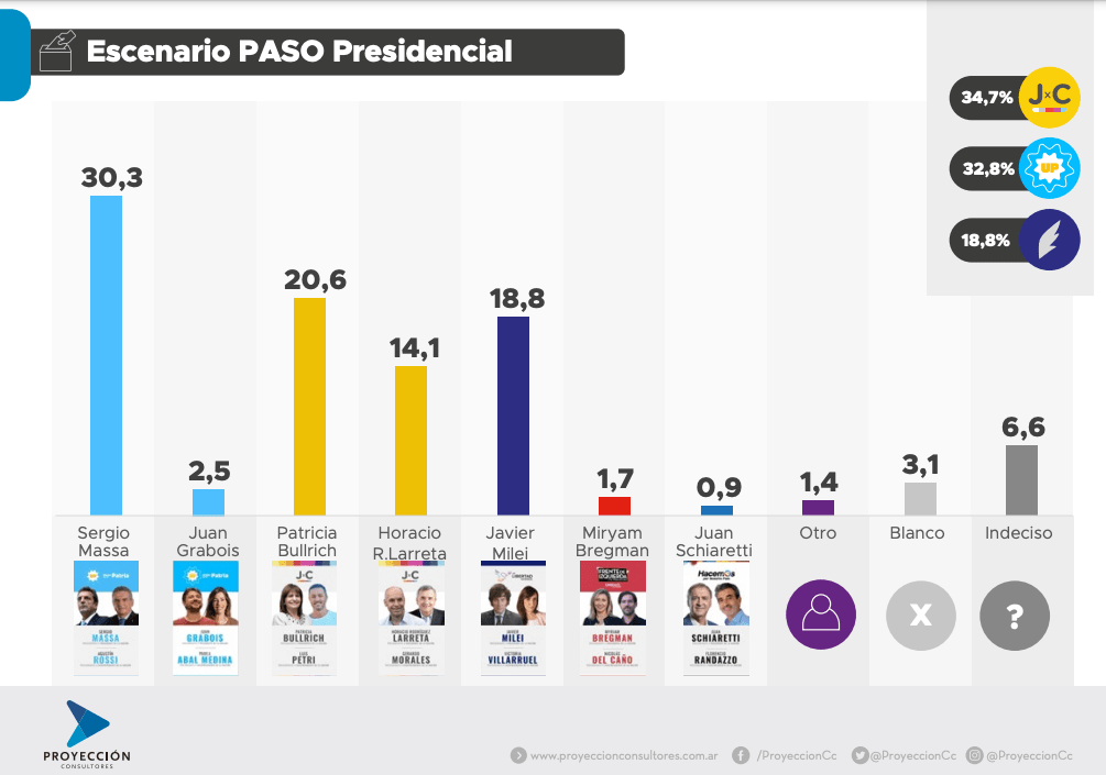 A nivel individual, Massa emerge como el presidenciable más votado, mientras que Bullrich y Larreta aparecen en empate técnico y Javier Milei, en caída respecto de lo dicho hasta hace poco.