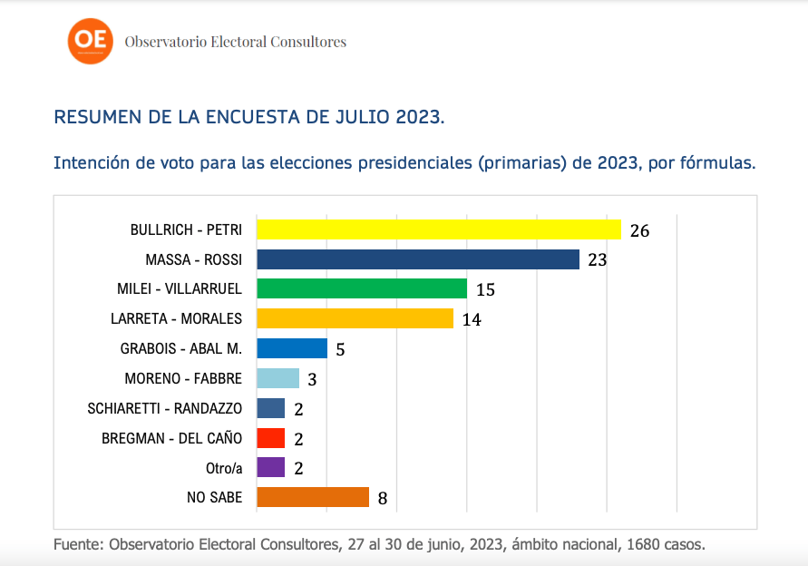 Elaborado por Observatorio Electoral Consultores, que dirige el politólogo Julio Burdman –acá tenés la información completa y la ficha técnica–, muestra al ministro de Economía segundo detrás de Patricia Bullrich, quien aparece fuerte y muy por encima de Horacio Rodríguez Larreta y a Juntos en 40%, 12 puntos porcentuales más que la UP. Por si eso fuera poco, Juan Grabois muerde bastante y otras dos fórmulas peronistas erosionan algo por afuera.