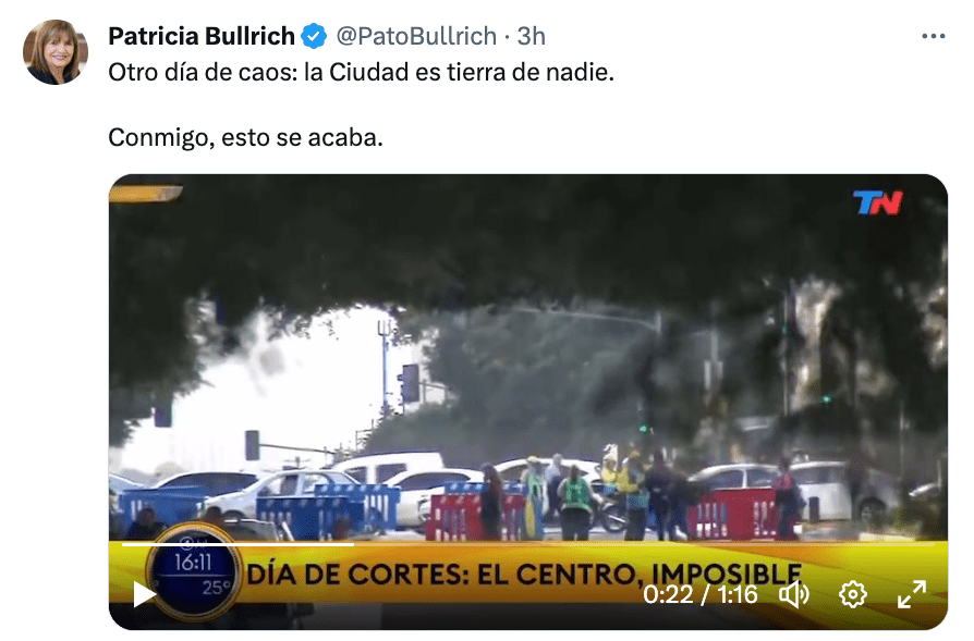 «La mayoría de la sociedad ve al bloqueo como una amenaza a su futuro. Durante muchos años el bloqueo no era necesariamente una amenaza a su futuro. Podría haber planes sociales y piquetes, pero era una molestia. Ahora el bloqueo es decir ‘dejo de de ser de clase media’, ‘dejo de ser un laburante’, ‘dejo de tener un futuro en la vida’ o ‘dejo de tener una casa porque me sacaron todo’», amplió. La solución sería, para ella, «derogar más leyes que las que se aprueben», eliminar en un año el déficit fiscal, terminar con los planes sociales, bajar impuestos y ordenar la calle con la fuerza del Estado. ¿La narrativa del momento?