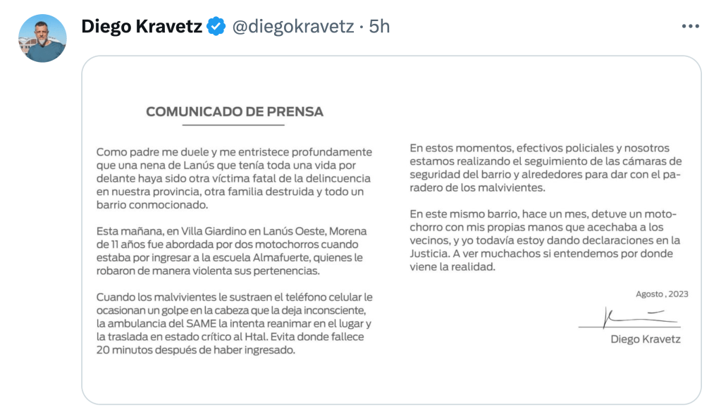 Morena murió frente a sus compañeros y compañeras a media cuadra de una escuela en la que una maestra había sido atacada en circunstancias similares hace poco. El caso de la pequeña no es entonces un hecho aislado, sino una moneda dramáticamente corriente, que lleva a preguntarse por lo que la dirigencia política que tuvo y tiene responsabilidades de gestión pretende de la gente. Así, lo mínimo que podía esperarse era que todos los precandidatos y precandidatas, tanto en el nivel nacional como en el provincial y el municipal, suspendieran sus actos de cierre de campaña. Así fue.
