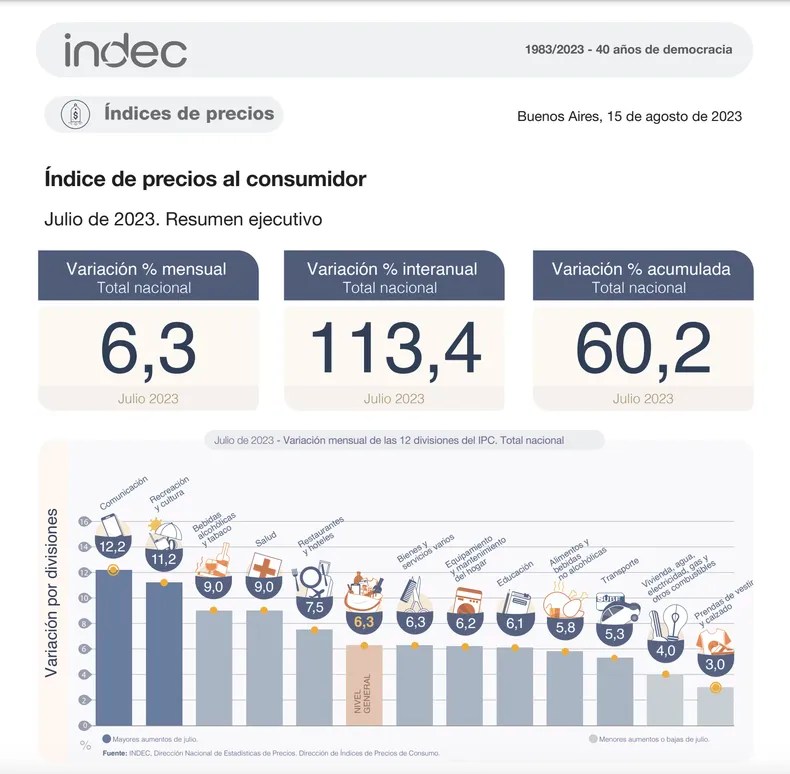 El INDEC anunció ayer el Índice de Precios al Consumidor (IPC) de julio, que llegó al 6,3%. Alimentos, minúsculo consuelo, arrojó 5,8%, por debajo del promedio.