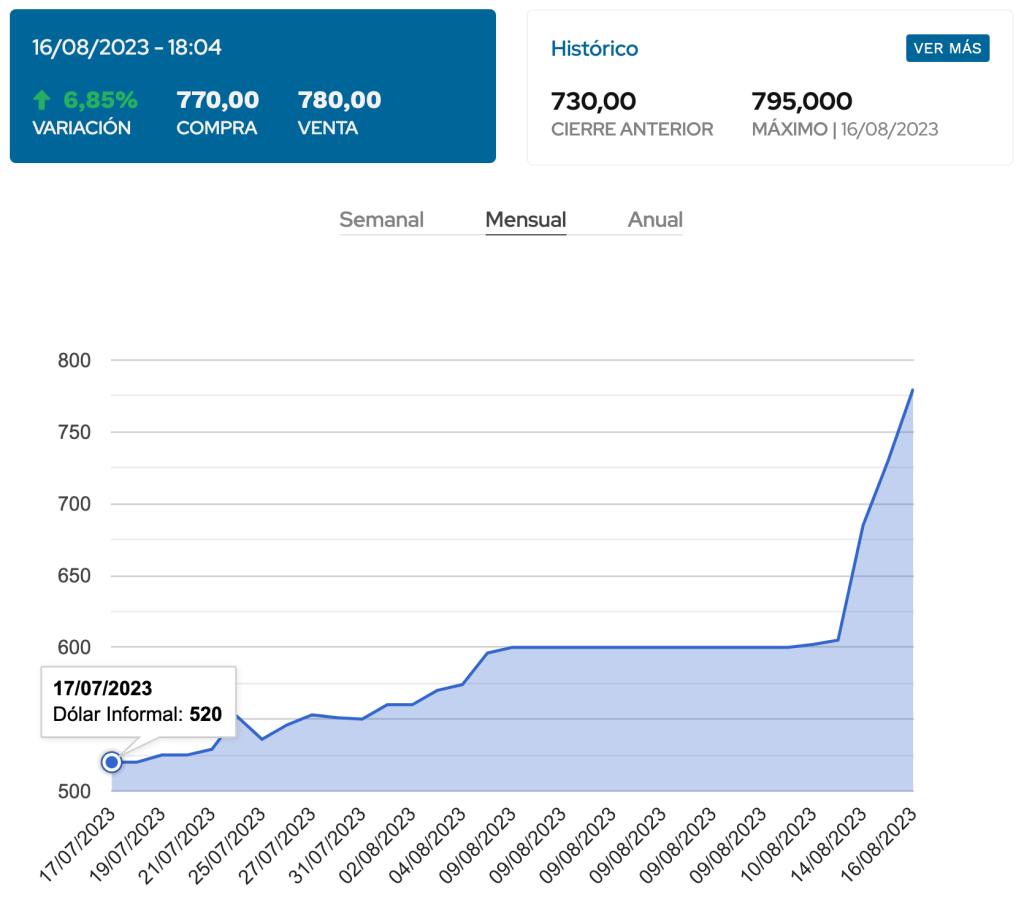 El ruido imperante confirmó una tendencia insostenible para el blue, a la que Massa –que no se va– necesita ponerle el pecho con urgencia. Esa paridad subió el mencionado 6,85% el miércoles, pero la cuenta se eleva a 39% en lo que va de agosto y a 50% en los últimos 30 días. La curva es vertiginosa.