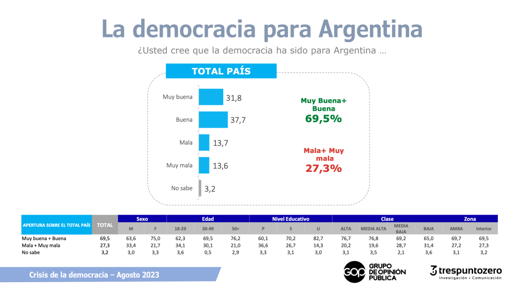 El trabajo se hace eco del debate creciente sobre el riesgo que el paleolibertarismo puede suponer para el pacto democrático posdictadura. De lejos, la imagen luce bien: casi el 70% de la gente cree que el sistema ha tenido efectos más bien positivos.