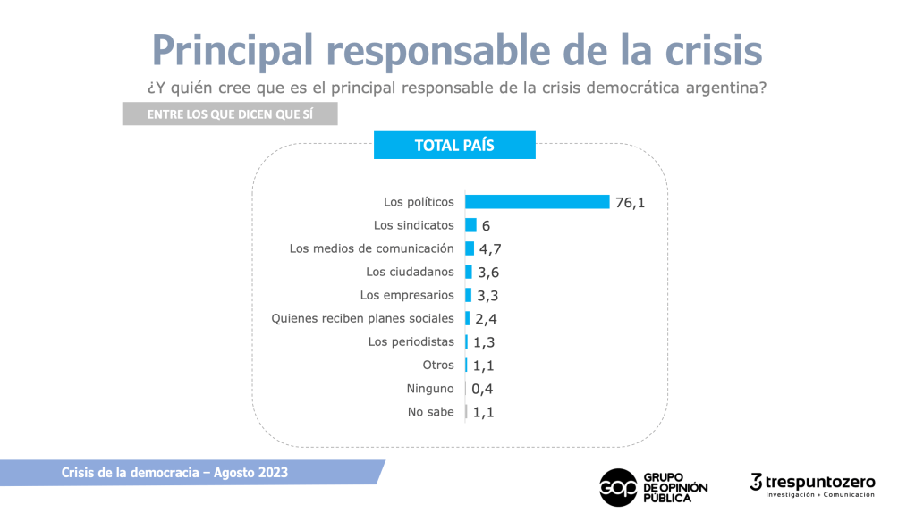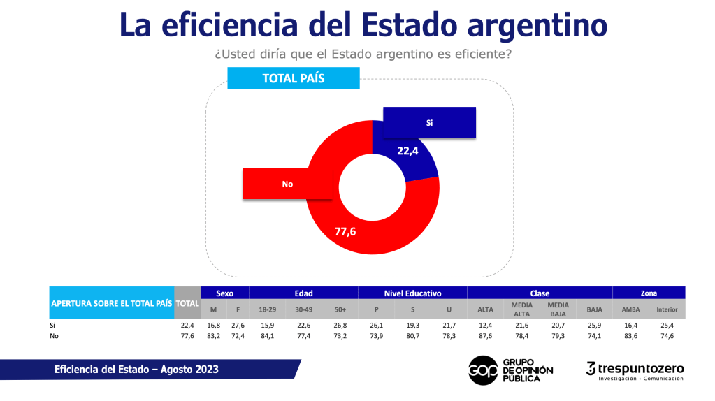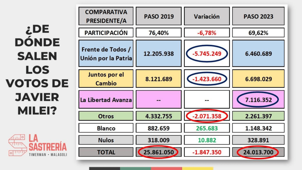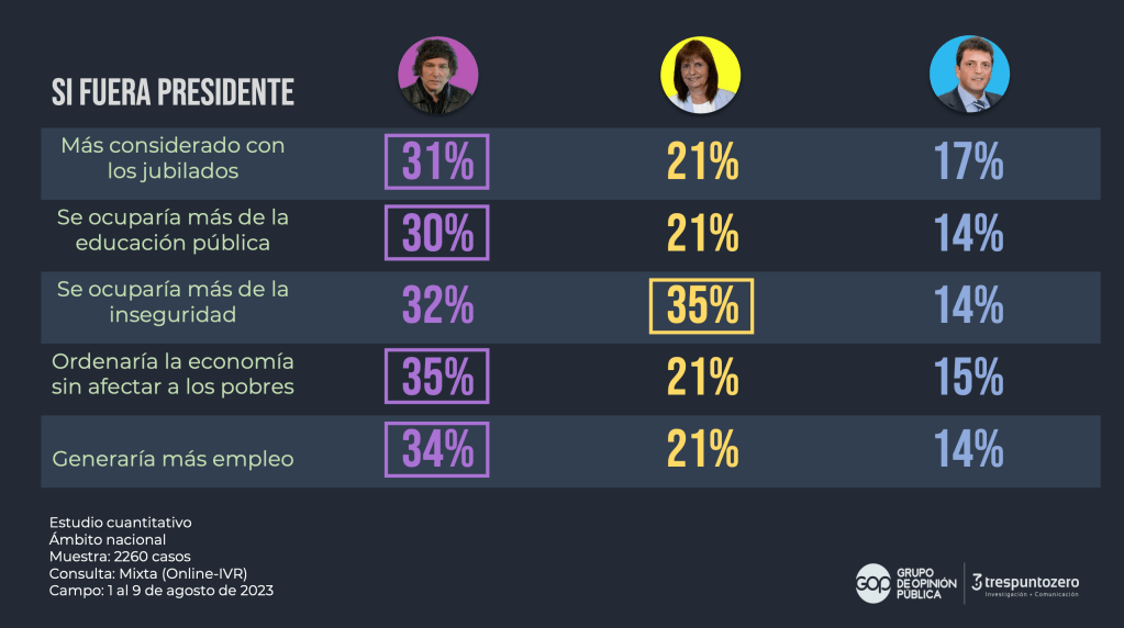 Un trabajo interesante de las consultoras trespuntozero y Grupo de Opinión Pública, dirigidas por Shila Vilker y Raúl Timerman, respectivamente, entrega claves valiosas sobre la relación entre el minarquista y quienes lo votan y lo votarán en una medida aún mayor que en las PASO. El estudio amerita preguntarle cosas como las siguientes: ¿todo pasa por la frustración económica y la inflación? Acaso, ¿hay algo más que lo explica, una suerte de «malestar en la cultura», el deseo de rearmar un ambiente, sobre todo simbólico, que se percibe roto?