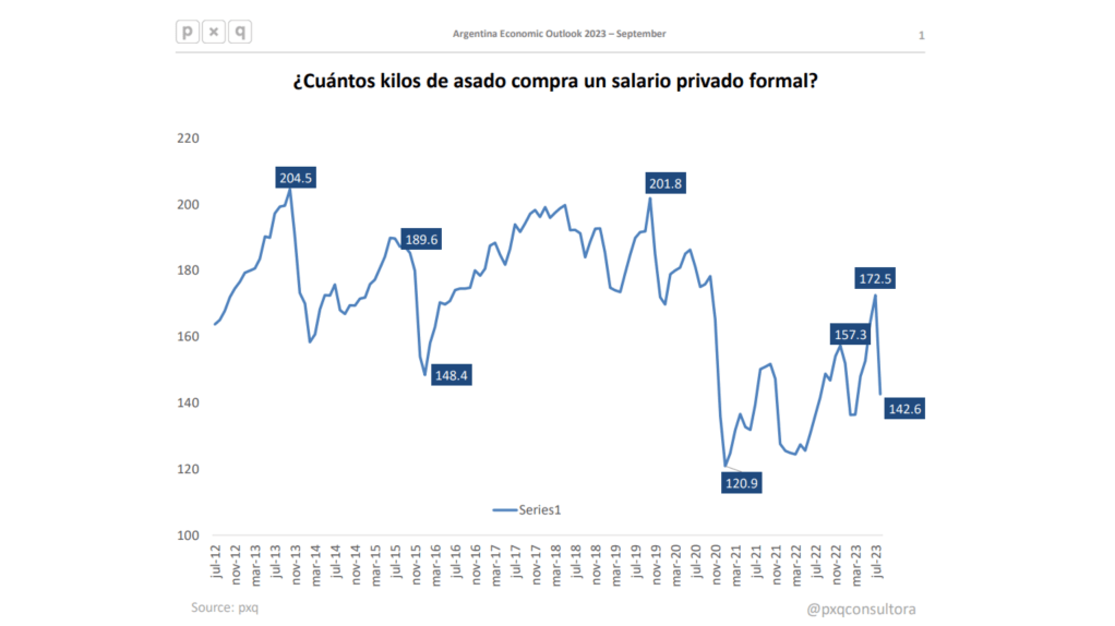 Se debe –o, mejor dicho, se puede– empezar por lo económico, por el «primer metro cuadrado». La caída del salario en términos de kilos de carne fue tomada por los autores del «índice heladera» de PxQ, la consultora del economista Emmanuel Álvarez Agis.