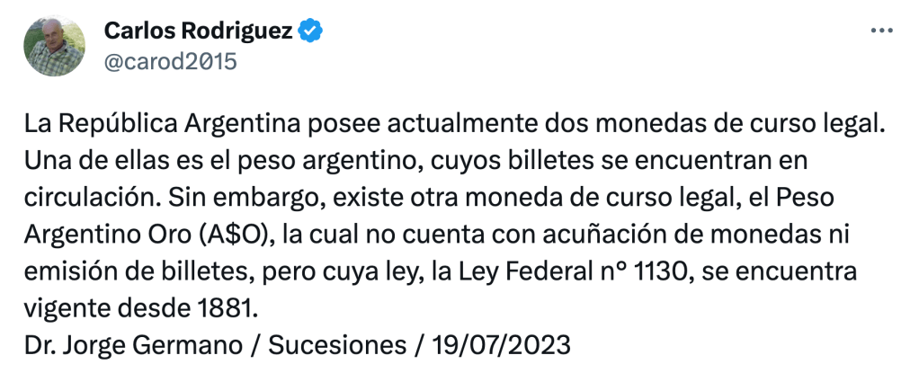 El equipo del paleolibertario salió a dar pelea como gato panza arriba. El principal ideólogo del esquema, Emilio Ocampo, defendió su lógica económica y pidió no caer en «juicios de valor». En tanto, el jefe de asesores Carlos Rodríguez –quien no comparte el entusiasmo del anterior respecto de una implementación veloz– argumentó que está vigente la ley 1.130 que establece la existencia de peso argentino oro, lo cual sería un gran argumento… si fuera cierto. La ley puede estar, pero esa no es una moneda realmente existente cuyo valor haya que mantener. No es por ahí, Rodríguez…
