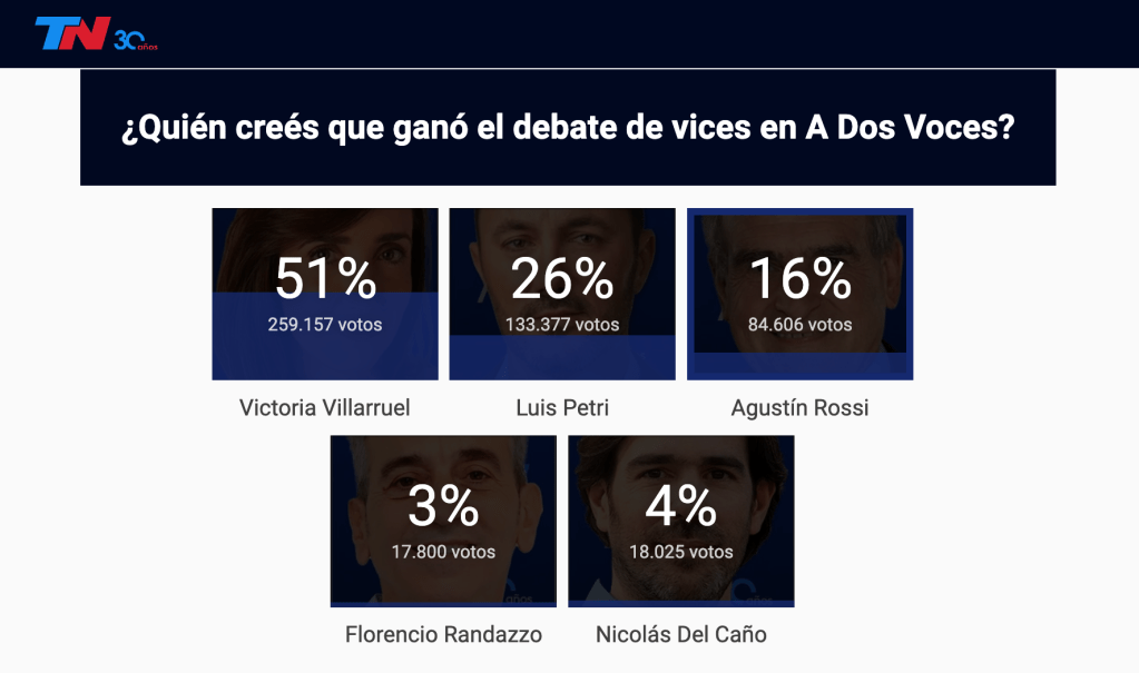 La «votación popular» sobre quién tuvo la mejor performance la ganaba al cierre de esta nota, justamente, la mujer de La Libertad Avanza (LLA), que se quedó con el 51% de los sufragios sobre un total de más de medio millón de participaciones. Más atrás quedaron Luis Petri –26%–, Agustín Rossi –16%–, Nicolás del Caño –4%– y Florencio Randazzo –3%–.