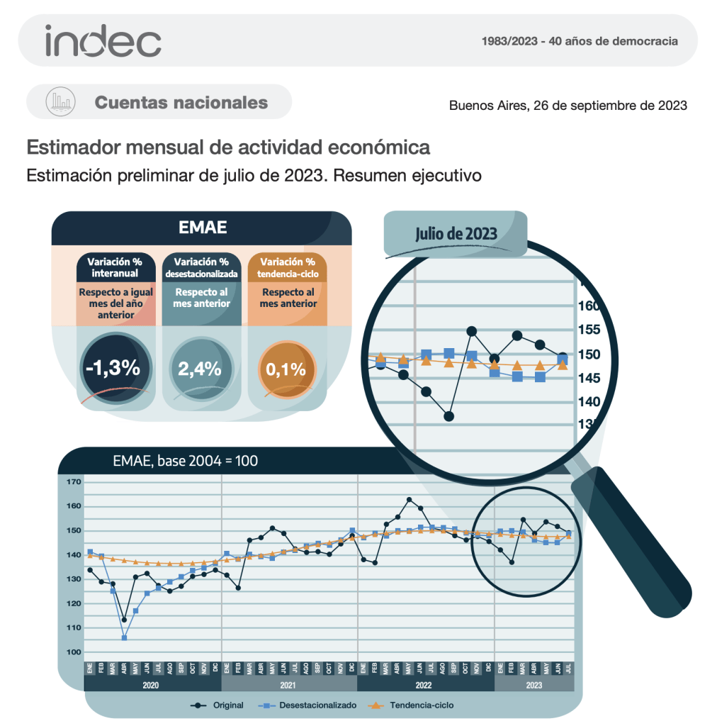 El Estimador Mensual de Actividad Económica (EMAE), el anticipo de los datos del PBI, arrojó en julio una caída interanual de 1,3%, aunque con un avance de 2,4% en relación con el mes anterior. Por si con la inflación hubiera poco, la economía se desliza ahora por una pendiente.