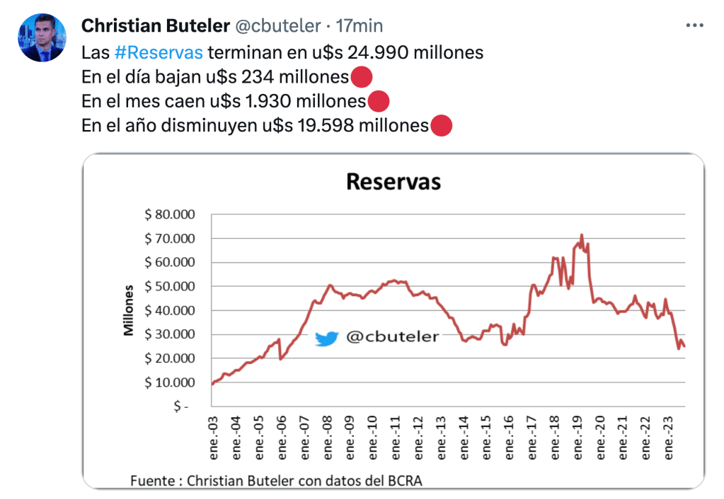 La autoridad monetaria lleva vendidos más de 800 millones de dólares en lo que va del mes –y mirá que falta, eh– y las reservas brutas perforaron a la baja la barrera de los 25.000 millones.