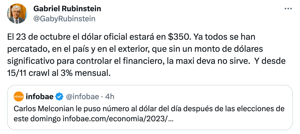 «Sigue saboteando a través de la mentira», respondió Eduardo Setti, secretario de Finanzas. «Melconian no leyó el acuerdo con el FMI, que establece un tipo de cambio fijo hasta el 15 de noviembre» y luego ajustes del 3% mensual, señaló, por su parte, el viceministro Gabriel Rubinstein. Salga como salga la elección.