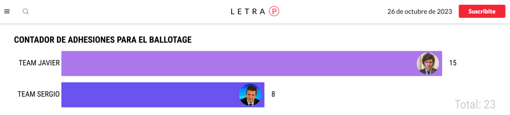 Letra P puso en funcionamiento un contador de adhesiones para el ballotage.