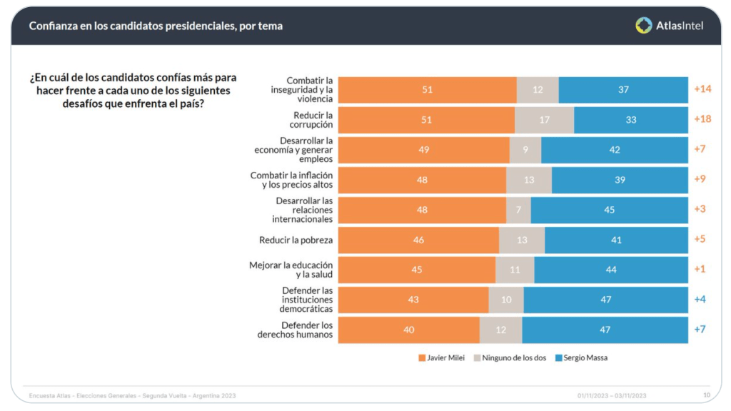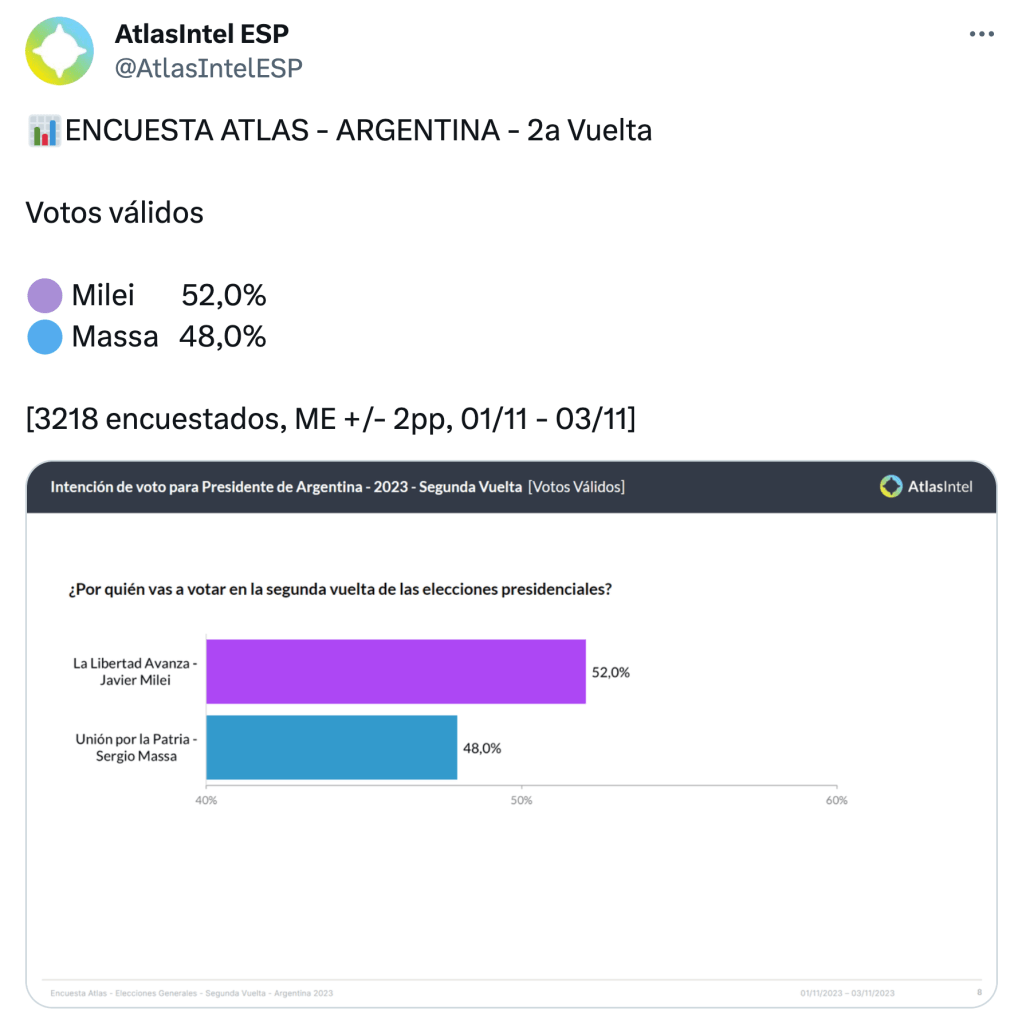 Uno de los sondeos que, contracorriente, previó que Massa saldría primero en las generales con una ventaja muy similar a la que obtuvo sobre Milei fue el de la firma brasileña Atlas Intel, justamente una de las que ahora muestra al paleolibertario en la delantera (online, 3.218 personas consultadas, del 1 al 3 de noviembre, margen de error +/- 2 puntos porcentuales).