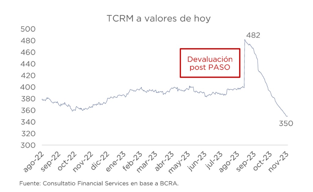 En tanto, Equilibra indica que «el tipo de cambio real llegará al ballotage aproximadamente 30% por debajo del lunes posterior a las PASO», cuando, recordemos, el Gobierno avaló una suba del 22% del oficial que impactó fuerte en los precios y llevó a la inflación a los dos dígitos mensuales.