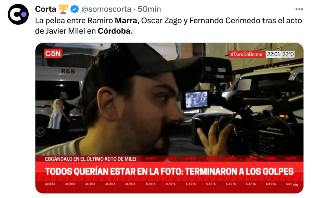 El ultra, acompañado por la obsesión antitikirchnerista de Patricia Bullrichy por sus más allegados, finalizó con un acto importante en Córdoba, que en el cierre hasta tuvo un toque de color: el diputado electo Oscar Zago y el estratega digital Fernando Cerimedo casi se agarraron a trompadas, mientras Ramiro Marra por momentos separaba y en otros se encargaba de increpar a camarógrafos para que no filmaran lo que ocurría.