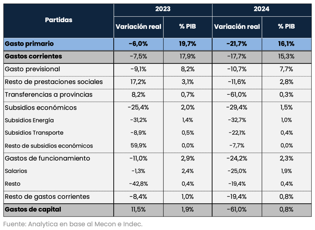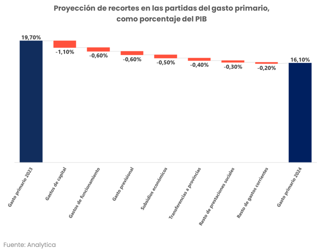 «En nuestra simulación, el gasto primario caerá 3,6 puntos del PBI el año que viene, explicado por una reducción de 2,5 puntos en los gastos corrientes y de 1,1 puntos en los gastos de capital», esto es de la obra pública, señala Analytica. Las jubilaciones y los planes sociales aportarán un ahorro del 0,8% del PBI a dicho esfuerzo.