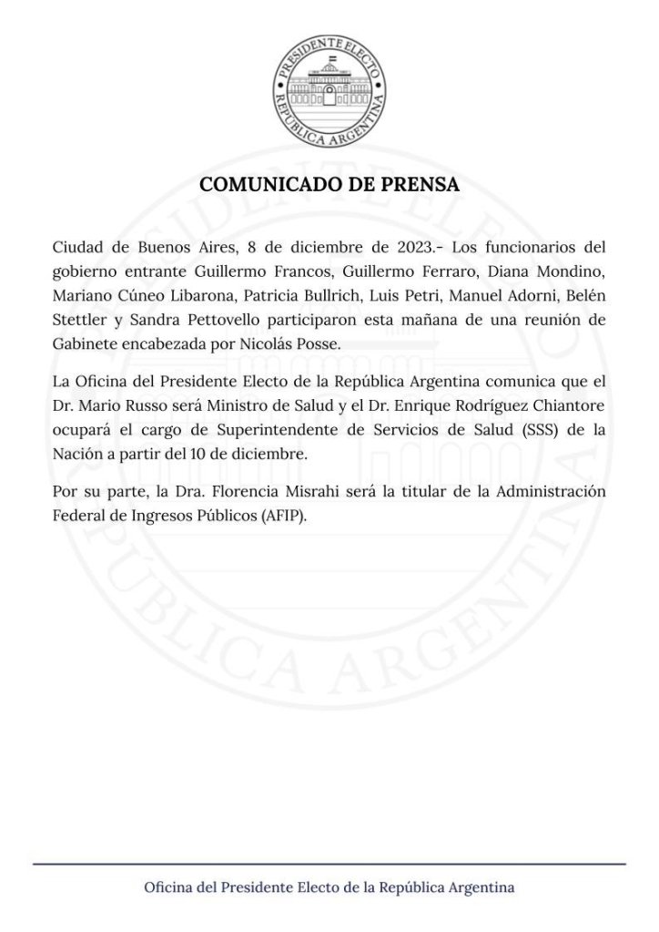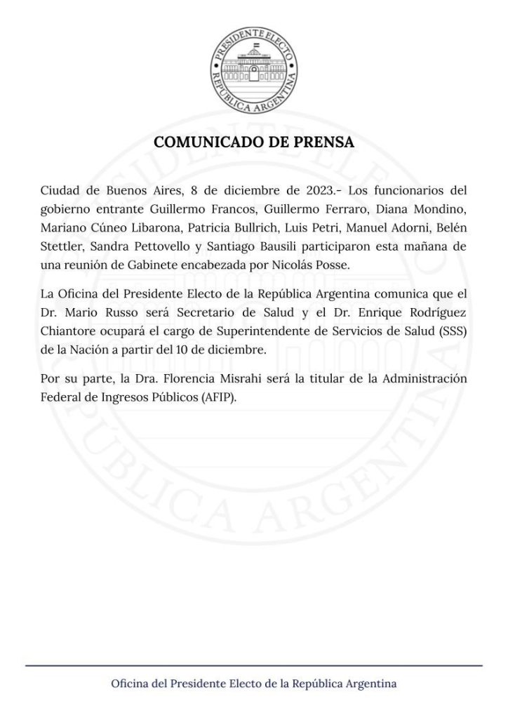 Él es quien tiene la obligación de ordenar ese caos. El viernes a la tarde, cuando todavía faltaba llenar casilleros fundamentales para empezar a gobernar, la «Oficina del Presidente Javier Milei» posteó en X las designaciones de Mario Russo como secretario de Salud, Enrique Rodríguez Chiantore como superintendente de Servicios de Salud y de Florencia Misrahi como titular de la AFIP. Nada menos… Lo curioso es que en minutos el mensaje fue borrado.