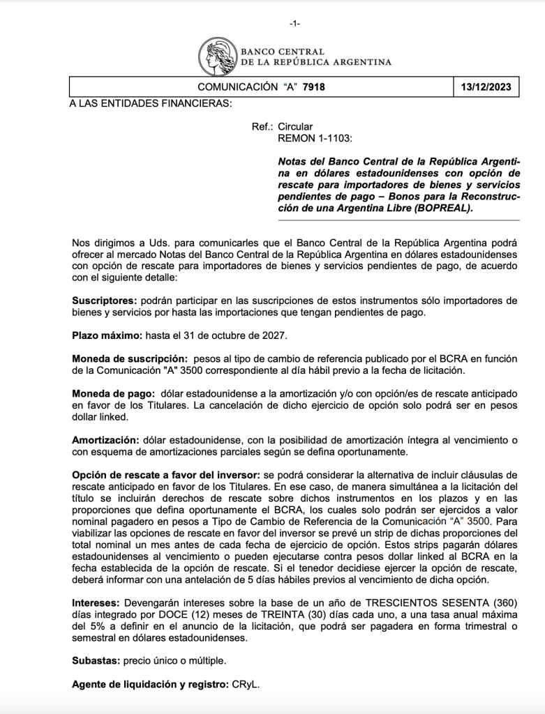 A través de la comunicación A 7918, el Banco Central lanzó este miércoles Bonos para la Reconstrucción de una Argentina Libre (Bopreal), que se suscriben en pesos y se pagan en dólares al vencimiento. Se trata de un modo de dar solución a la deuda que la autoridad monetaria mantenía con importadores de bienes y servicios, uno de sus numerosos y abultados pasivos.