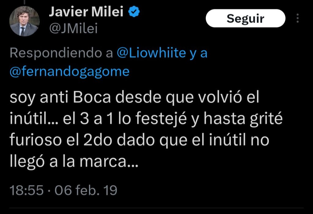 Lo que predominó fue el recuerdo de las declaraciones y posteos en X en los que se declaró exhincha de Boca, condición que dijo haber abandonado cuando Angelici repatrió a Fernando Gago –a quien detesta por alguna razón que se desconoce– y, más recientemente, cuando «el populismo» se hizo con el club de la mano de Ameal y Riquelme. Es más, en ese temperamento dijo haberse hecho simpatizante de River y haber gozado por el triunfo de este cuadro en la final de Madrid. Es, claro, es la derrota que más dolió en la historia del club.