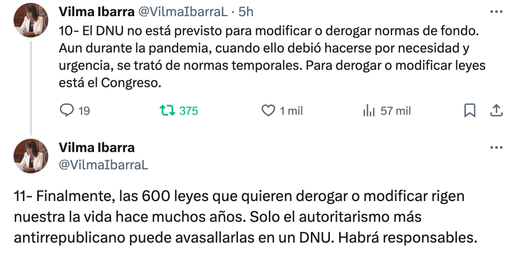 Asimismo, la respetada Vilma Ibarra sumó un argumento que pasó por debajo de demasiados radares. «Todo parece indicar que este mega-DNU habría sido confeccionado por estudios jurídicos privados (…). Alarma (…) grave: ¿quién elaboró este DNU? Si fueron estudios jurídicos privados es gravísimo y no puede permitirse ni normalizarse», dijo.