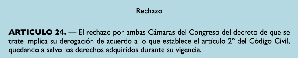 El Congreso debería rever la fallida ley 26.122, que regula los DNU desde 2006, por iniciativa de Néstor Kirchner, de un modo abusivo en favor del Poder Ejecutivo. Esto es así porque condiciona al Congreso al obligarlo a votar negativamente en las dos cámaras para derogarlos, al revés de lo que ocurriría con cualquier proyecto de ley común. El problema es que ya es tarde para evitar este Decretazo.