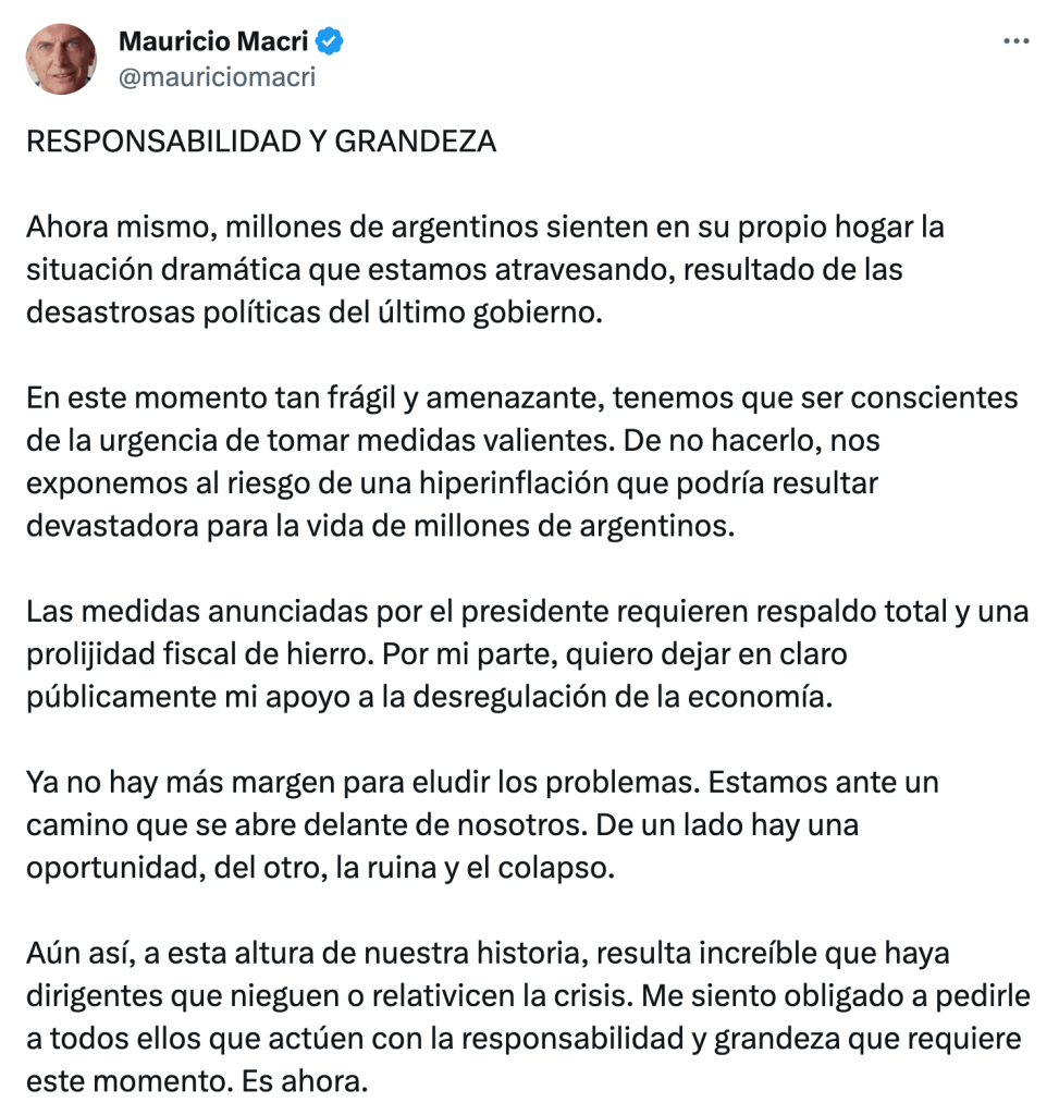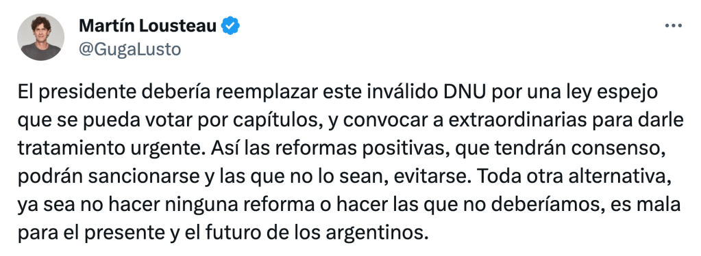 Siempre escrupulosa con las formas republicanas, la UCR –que, entre derecha e izquierda-populismo, tiene la llave del cuórum en la Cámara de Diputados– invitó al ultraderechista a retrotraer el DNU y enviar su contenido en forma de proyectos de ley. El nuevo jefe radical, Martín Lousteau, incluso anticipó que eso podría encontrar eco dado su acuerdo en que «debemos cambiar muchas cosas en Argentina, entre ellas el improductivo desempeño de partes de nuestro Estado y regulaciones que traban el buen funcionamiento de diversos sectores de la economía».