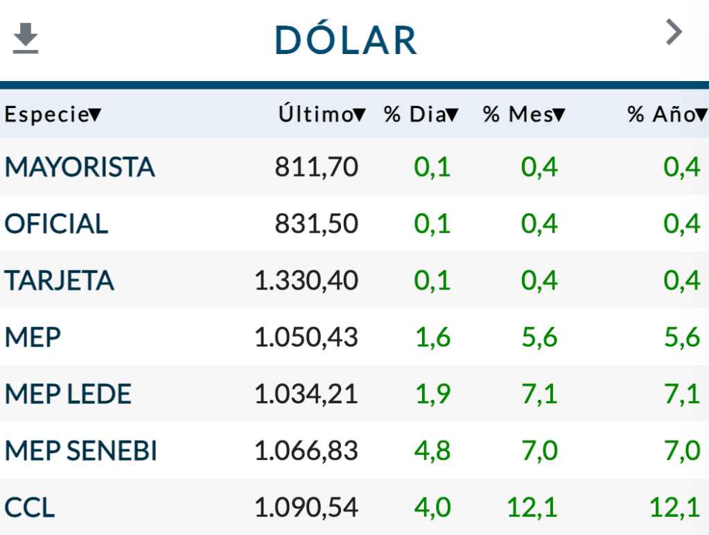 En concreto, la tendencia descripta este jueves por este medio se prolongó durante la rueda. El dólar MEP –negociado en bolsa, a través de la compra y venta de títulos o acciones, y que no sale del país– quebró un récord nominal y el «contado con liquidación» –CCL, igual que el anterior pero que sirve para sacar fondos legalmente del país– subió 4% más, superó el 12% en lo poco que va del año y acumula nada menos que 25% en las últimas cinco jornadas hábiles.