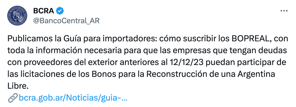 - En relación con lo anterior, llamó la atención el fracaso –el segundo en fila– de la licitación del Bono para la Reconstrucción de una Argentina Libre (Bopreal), el instrumento con el que el Banco Central pretende consolidar la deuda por la entrega de divisas que mantiene con importadores. Entre los problemas de diseño del bono y la sospecha de muchos en el mercado de que hay empresas que reclaman dólares, pero que están flojas de papeles para hacerlo, la autoridad monetaria captó ayer apenas 57 millones de dólares, el 7,6% de lo ofrecido…