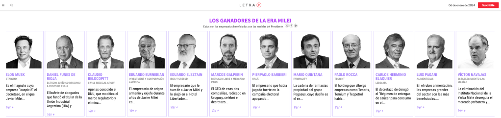 Tal como muestra Letra P en su listado de ganadores de la nueva era, cabe señalar que, más allá de que Milei liquide la inflación –como promete– o no, y de que termine por hacer de Argentina una próspera Irlanda de acá a 45 años, el gran empresariado local y algunos importantes jugadores internacionales se han lanzado a una carrera por quedarse con recursos estratégicos, con porciones relevantes de mercado y, sobre todo, con un pedazo más grande de la torta del ingreso nacional a través de subas desmesuradas de sus márgenes de rentabilidad.