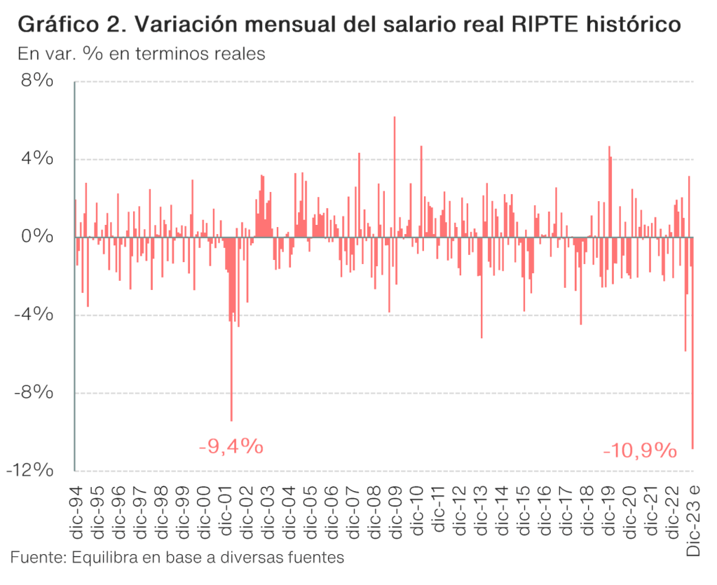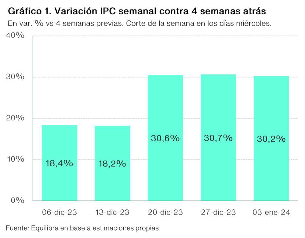 De acuerdo con la consultora Equilibra, «la elevada inflación de la primera semana de enero, más el arrastre ‘inflacionario’ que deja diciembre junto con la reacción esperada de los salarios, nos llevan a pensar que la inflación de enero será similar al 26% estimado en diciembre. La inflación acumulada en el bimestre diciembre-enero rondaría entre 55% y 60%».