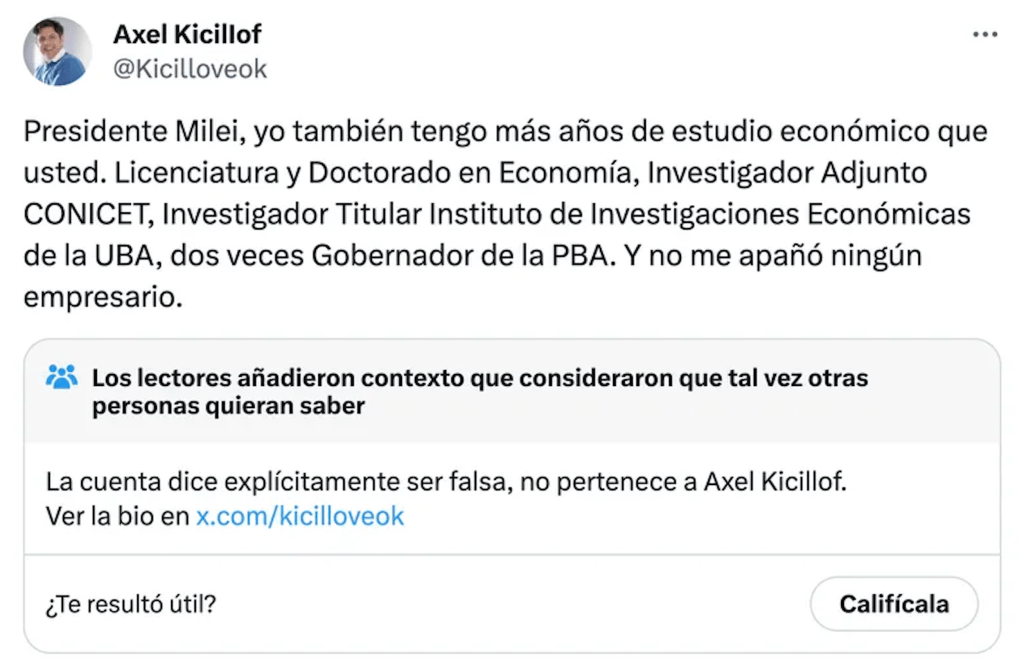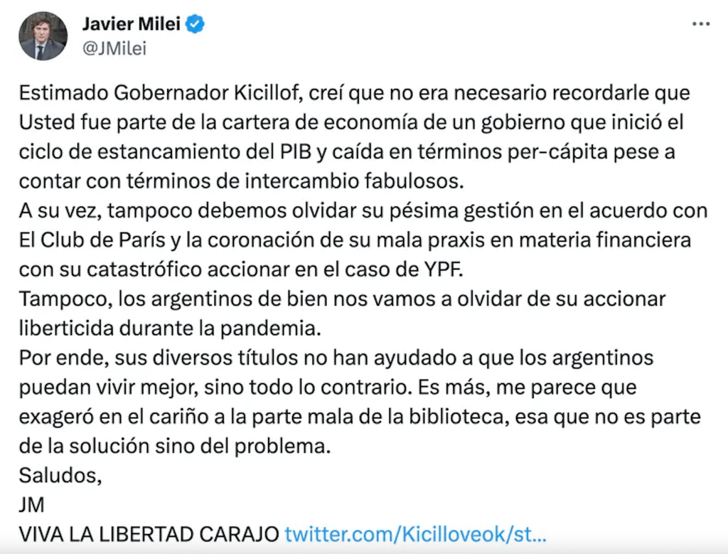 Advertido de que el mensaje que motivó su diatriba había sido escrito por «Axel Kici Love», una cuenta de 5.700 seguidores, mandó al equipo de comunicación de la Presidencia a difundir otro posteo en el que insiste en su argumentación arrobando al verdadero gobernador bonaerense. No hay remate.