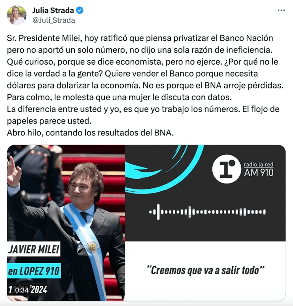 La defensa que hizo la diputada peronista Julia Strada del carácter estatal del Banco Nación motivó a Milei a descalificarla en una entrevista radial como «una pseudoeconomista floja de papeles». Strada, a su vez, le contestó con un hilo en el que deshizo, con datos precisos, la porfía presidencial en privatizar una entidad que no solo es clave para el desarrollo nacional, sino que gana dinero. Parece que el hombre se quedó con la sangre en el ojo.