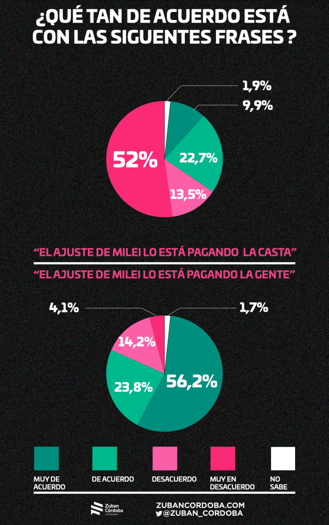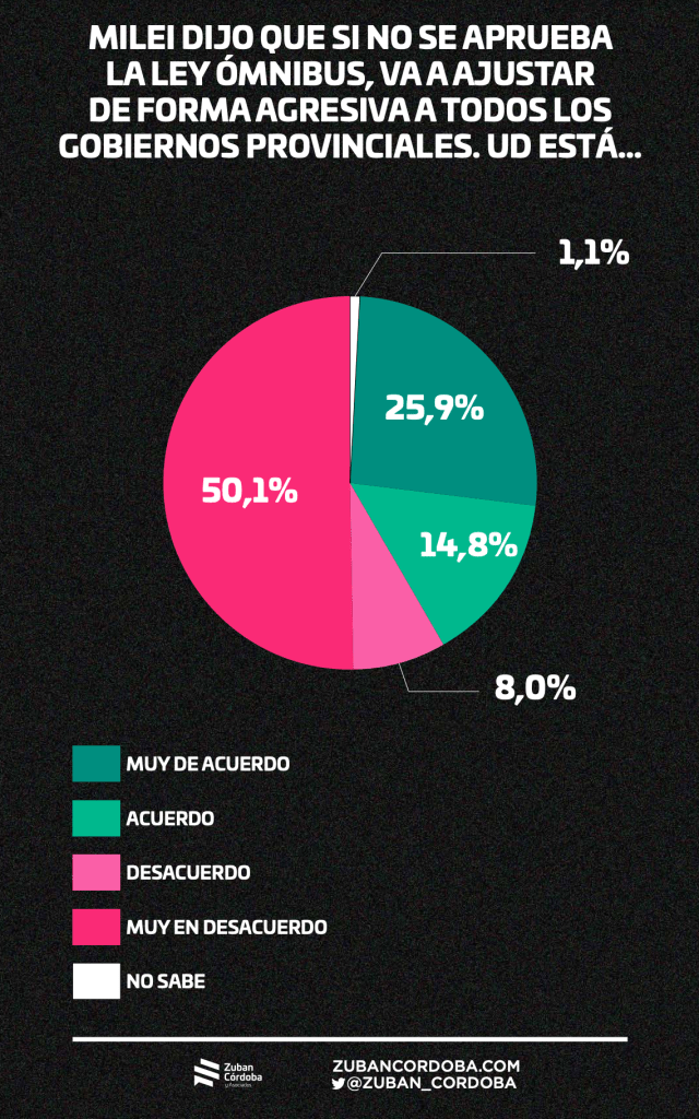 Aun así, el Presidente sigue contando con la adhesión de un núcleo duro del 30 al 35%, pero se ha puesto enfrente de un 58% que desaprueba que el ajuste lo paguen las provincias.